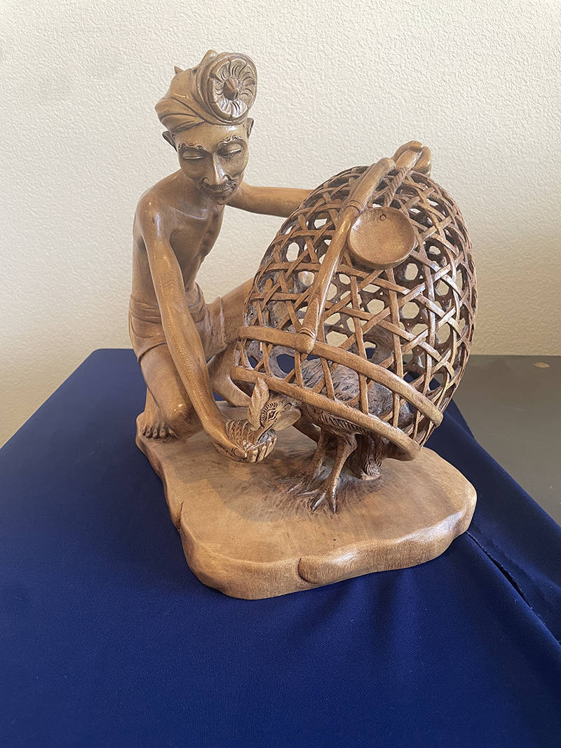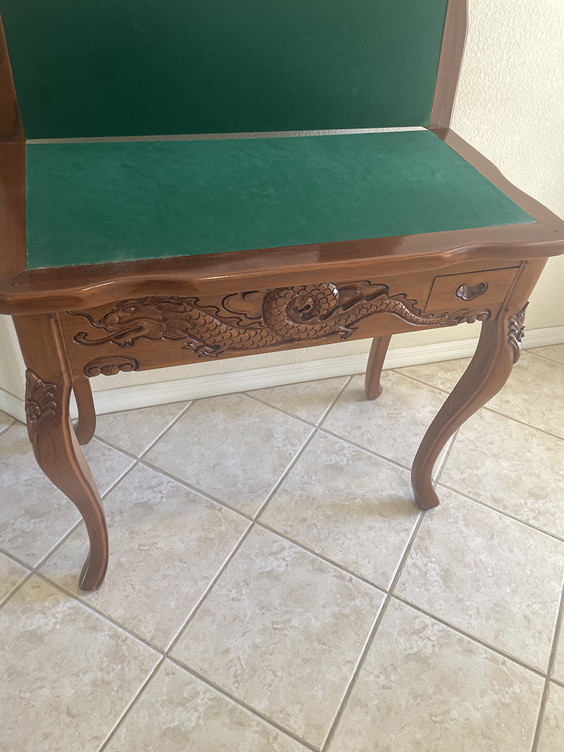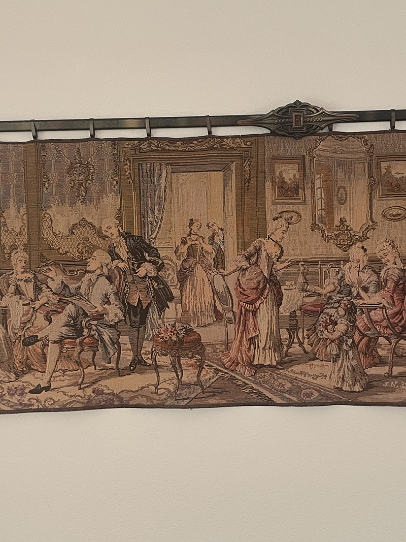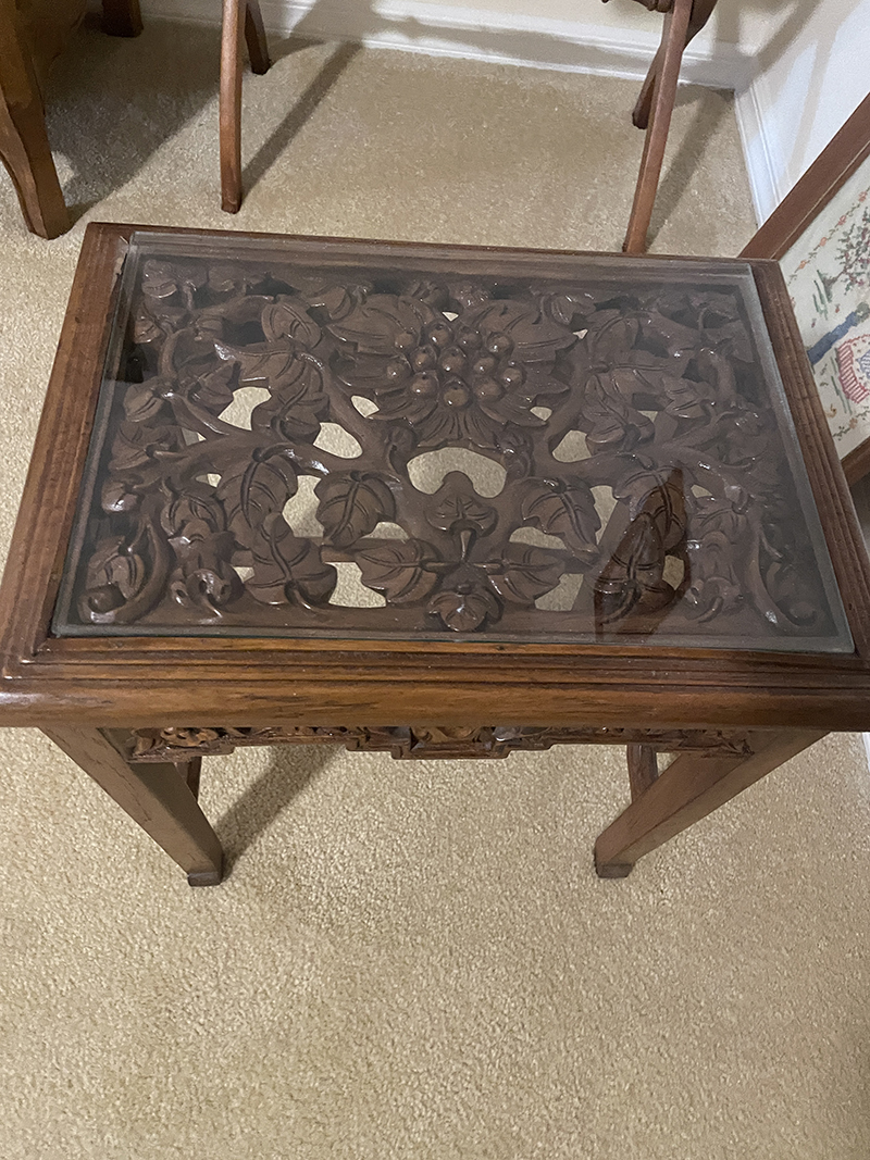 featuring exquisite wood carvings, beautiful tables and chests, and a classic four-poster bed.